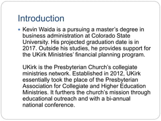 Kevin Waida is pursuing a master's degree in business administration at Colorado State University, graduating in 2017, while also supporting the ukirk ministries' financial planning program. Ukirk, established in 2012, serves the Presbyterian Church's collegiate ministries network by promoting best practices and providing resources to support collegiate Presbyterian student groups. Their website offers valuable information for those interested in starting such groups, detailing the processes and challenges involved.