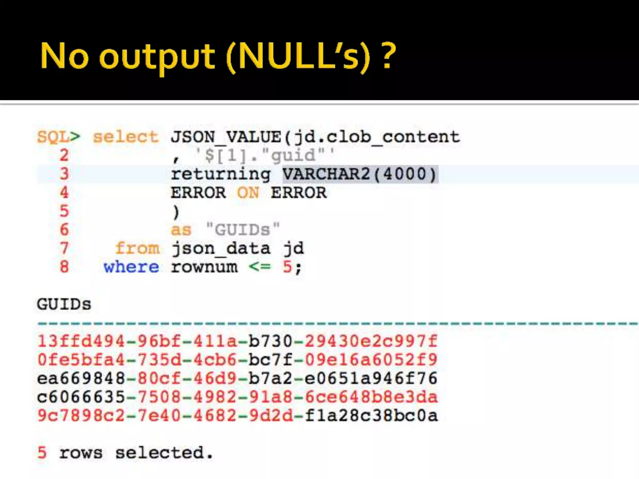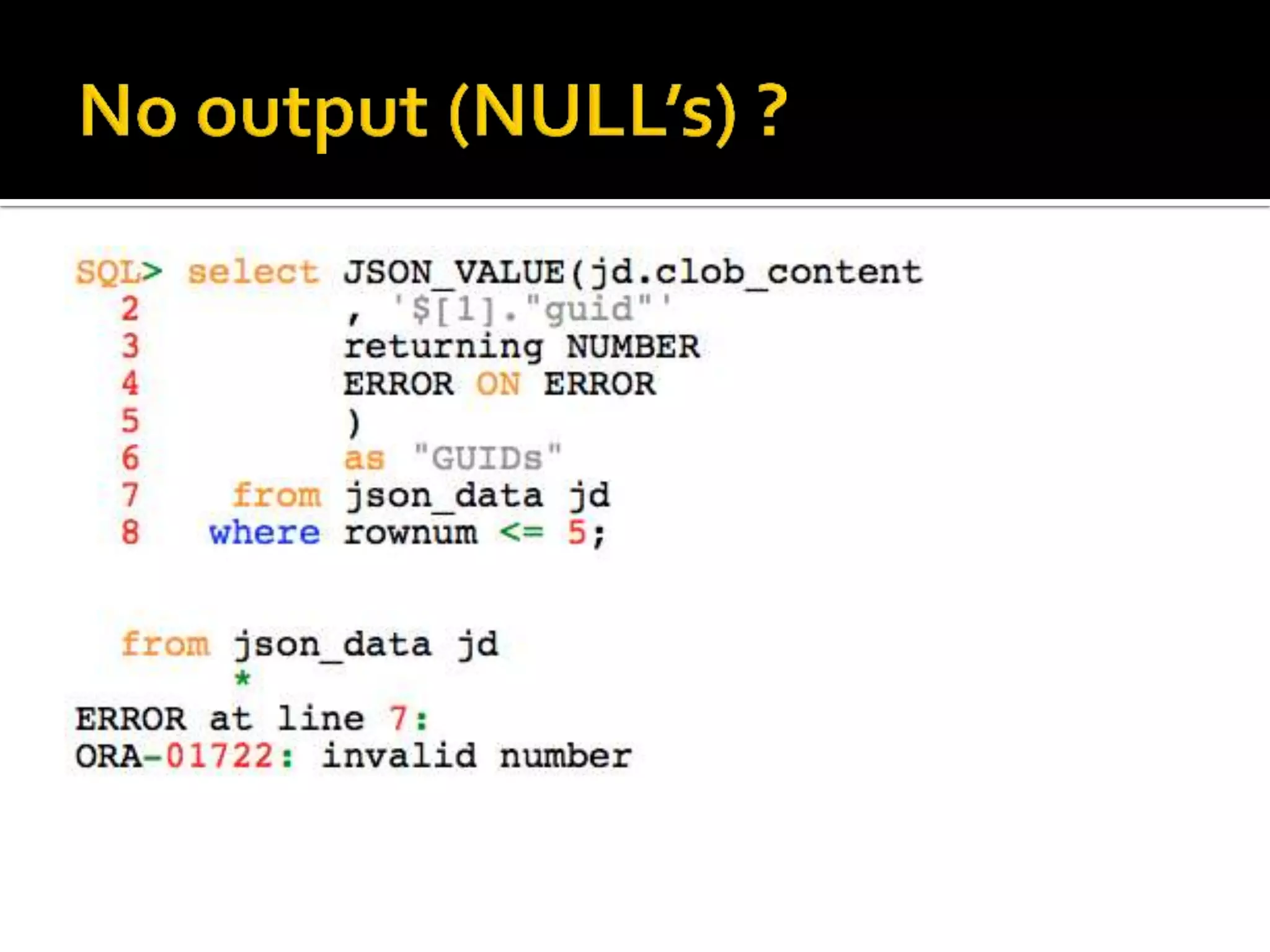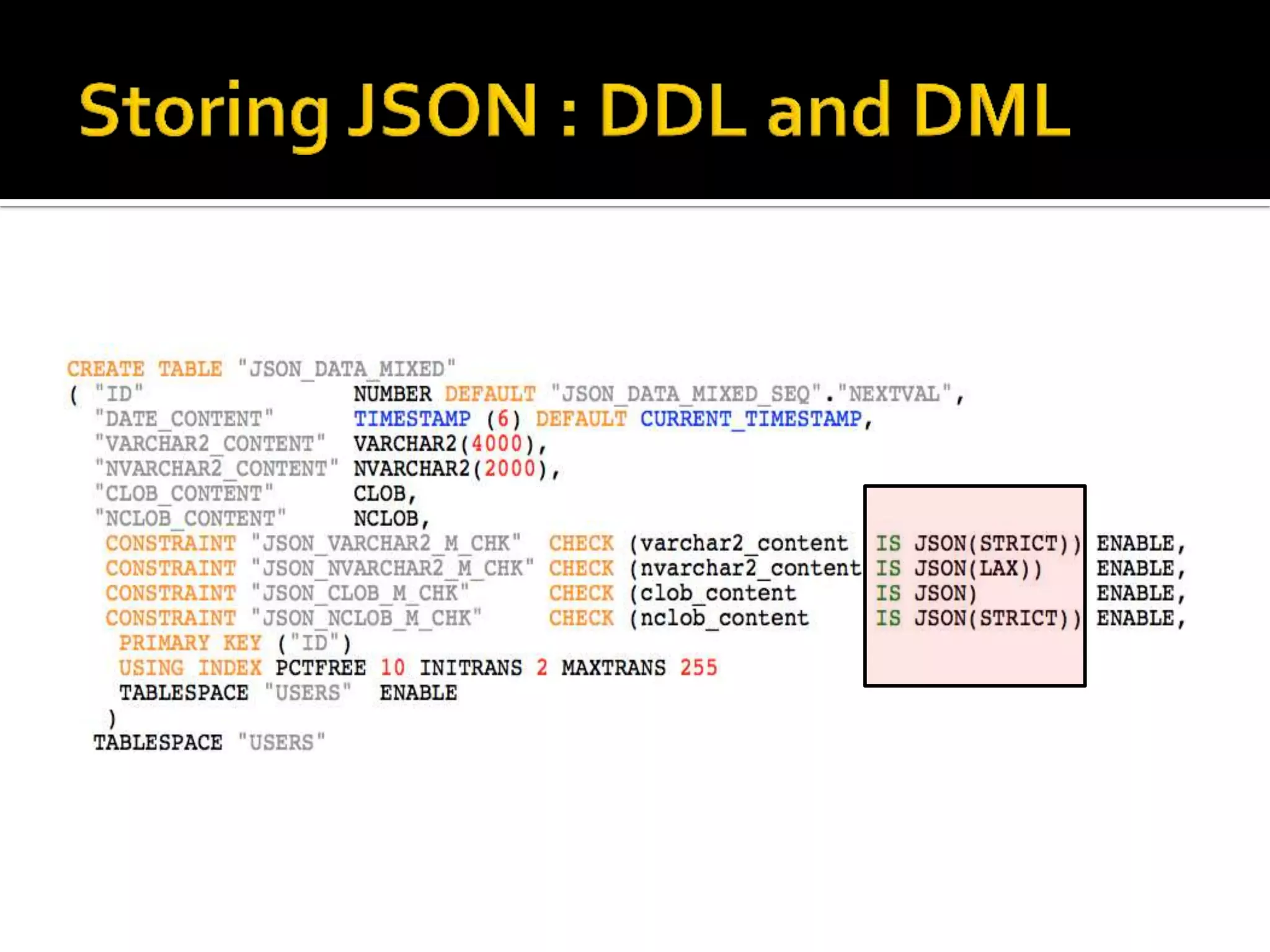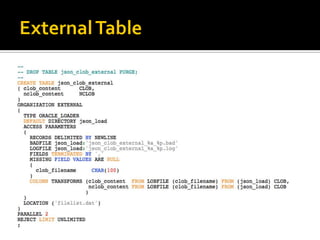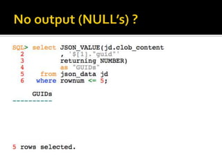 The document outlines the features and functionalities of JSON management in Oracle Database 12.1.0.2.0, including storage, indexing, and querying capabilities, as well as compatibility with SQL through new JSON operators and path expressions. It details various JSON-related functions such as json_value, json_query, and json_exists, presenting examples of syntax and implementation. The document also discusses error handling, ensuring the validity of JSON documents, and performance considerations in storing and managing JSON data.