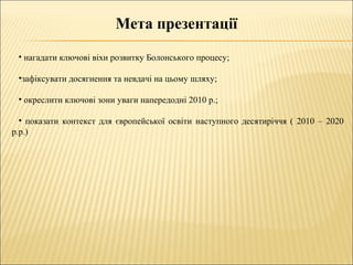 • показати контекст для європейської освіти наступного десятиріччя ( 2010 – 2020