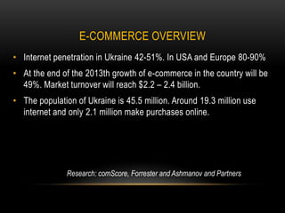 This document provides an overview of the Ukrainian DIY e-commerce market. It finds that while internet penetration in Ukraine is 42-51%, only 2.1 million Ukrainians make online purchases, compared to 19.3 million internet users. The DIY segment saw 602% growth on the Prom.ua e-commerce platform from 2012 to 2013. Most Ukrainian e-shops earn revenue by driving customers to find products on price comparison sites and then purchase from a smaller e-shop with the best price. The top e-retailer in Ukraine is Rozetka.ua, while other major players like Grohe and Joyou currently only offer online product catalogs without purchasing capabilities.