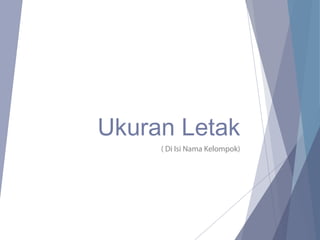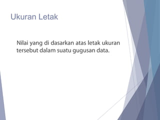 Dokumen ini membahas berbagai ukuran letak dalam suatu distribusi data, termasuk median, kuartil, desil, dan persentil. Median adalah ukuran nilai sentral yang membagi distribusi data menjadi dua bagian yang sama. Kuartil membagi data menjadi empat bagian yang sama, sementara desil dan persentil membagi data menjadi sepuluh dan seratus bagian yang sama.