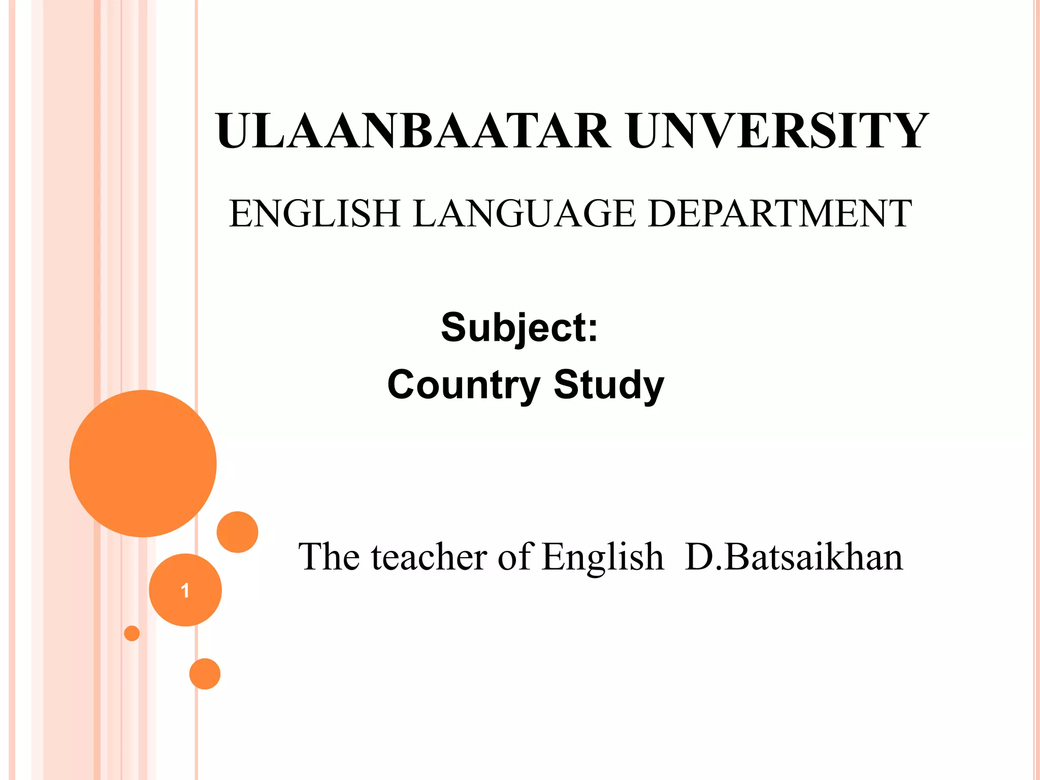 This document outlines a Country Study course for sophomore English students at Ulaanbaatar University. The course is worth 2 credits over 32 hours and will be taught in the fourth term. The objective is for students to gain basic knowledge of their chosen country through online research, videos, and texts. Students will learn to contact a student in the chosen country and learn about a landmark through distance learning. They will also study how time zones affect the world and improve their writing, typing, listening, and presentation skills by working collaboratively to present on their country to peers. The self-study will involve studying the USA in weeks 1 and 3 by learning about states and holidays in groups. Week 2 will focus on an individual paper on
