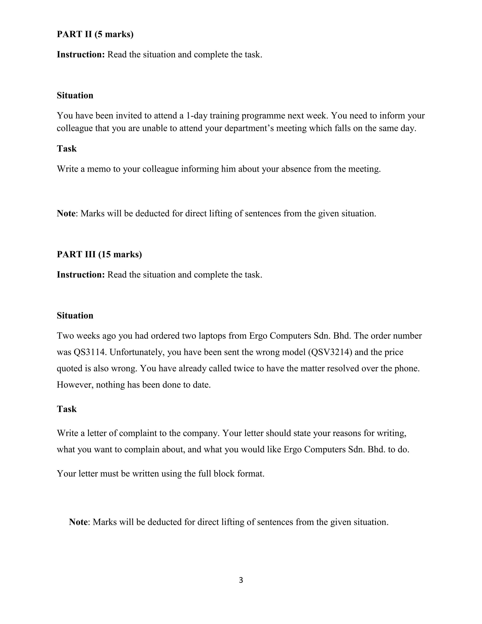 2) Write a memo to a colleague informing them that you will miss an upcoming department meeting because you will be attending a one-day training program.