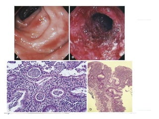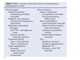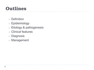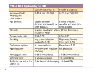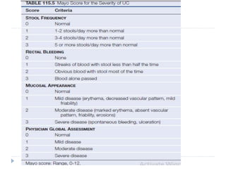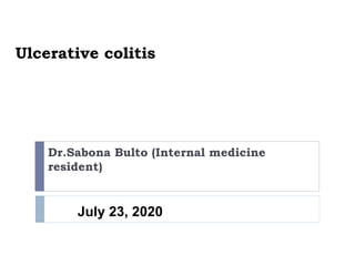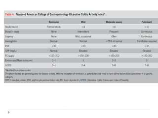 Ulcerative colitis is a chronic inflammatory bowel disease that affects the colon. This document provides an overview of the definition, epidemiology, etiology, clinical features, diagnosis, and management of ulcerative colitis. It defines ulcerative colitis and describes the extent of disease involvement. Key points include that the goal of management is sustained remission through the use of medications such as aminosalicylates, immunomodulators, biologics, and surgery if needed.