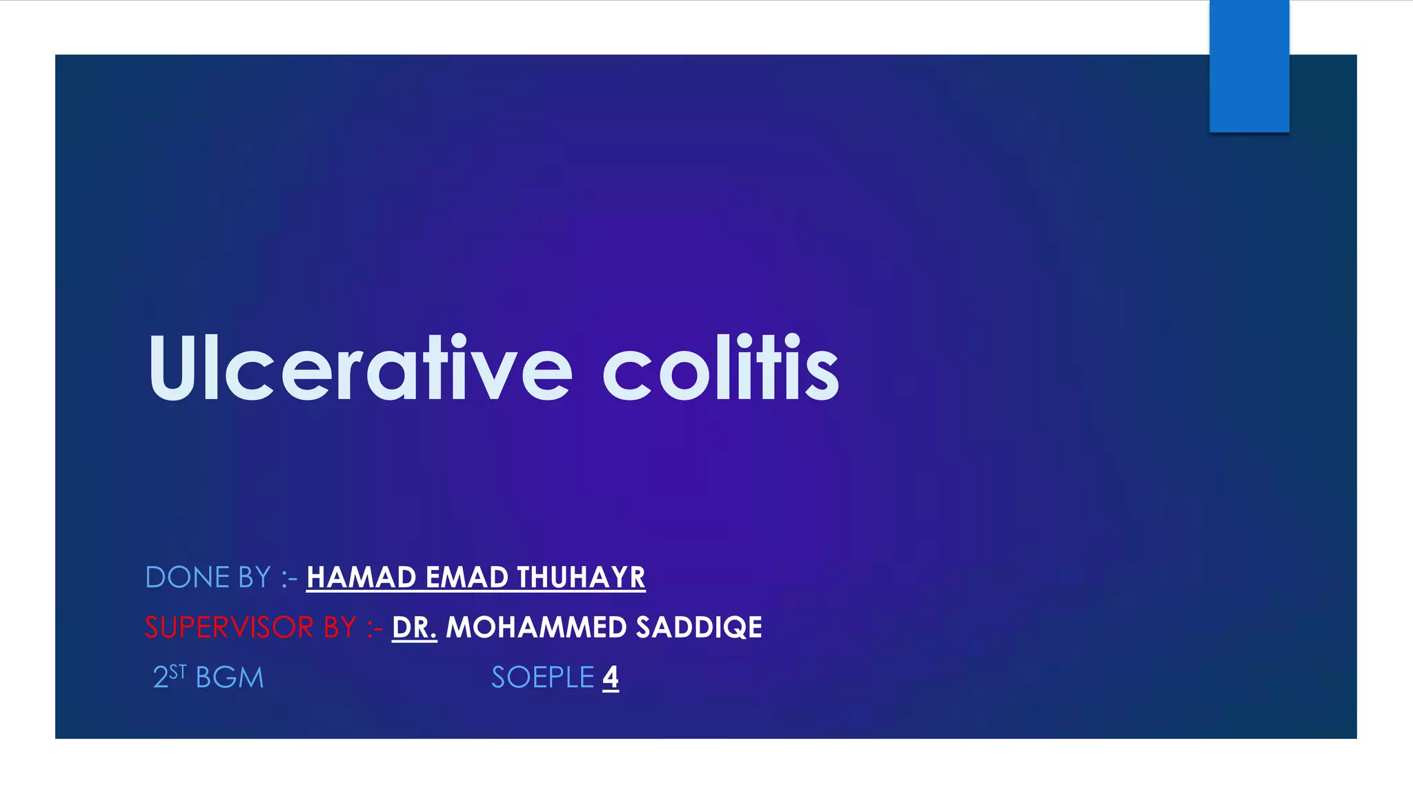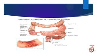 Ulcerative colitis is a chronic inflammatory disease of the colon that causes diarrhea, abdominal pain, and rectal bleeding. The disease involves inflammation and ulceration of the innermost lining of the colon. A colonoscopy with biopsies is usually required for diagnosis. Treatment involves medications to reduce inflammation and surgery to remove the colon in severe cases. Complications can include severe bleeding, colon perforation, and an increased risk of colon cancer.