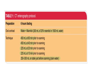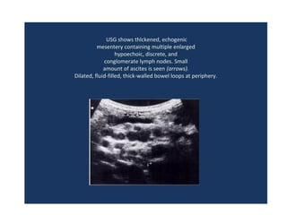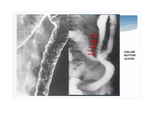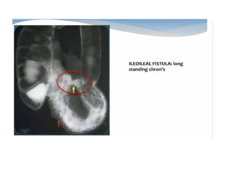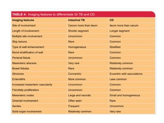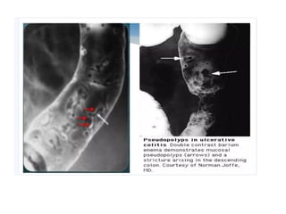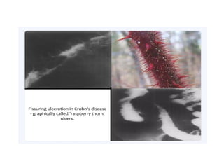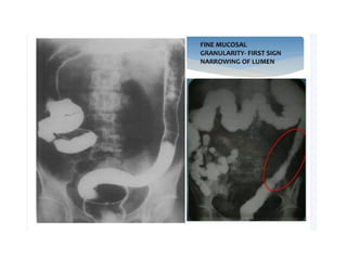 The document discusses advancements in imaging techniques for ulceroconstrictive diseases of the gut, emphasizing the transition from traditional methods like plain radiographs and barium studies to modern approaches such as CT enterography and MRI. It details various imaging modalities' effectiveness in diagnosing gastrointestinal conditions including tuberculosis and inflammatory bowel diseases. Notably, it highlights the diagnostic advantages of newer techniques in assessing bowel strictures and distinguishing between active inflammation and fibrotic changes in conditions like Crohn's disease and ulcerative colitis.
