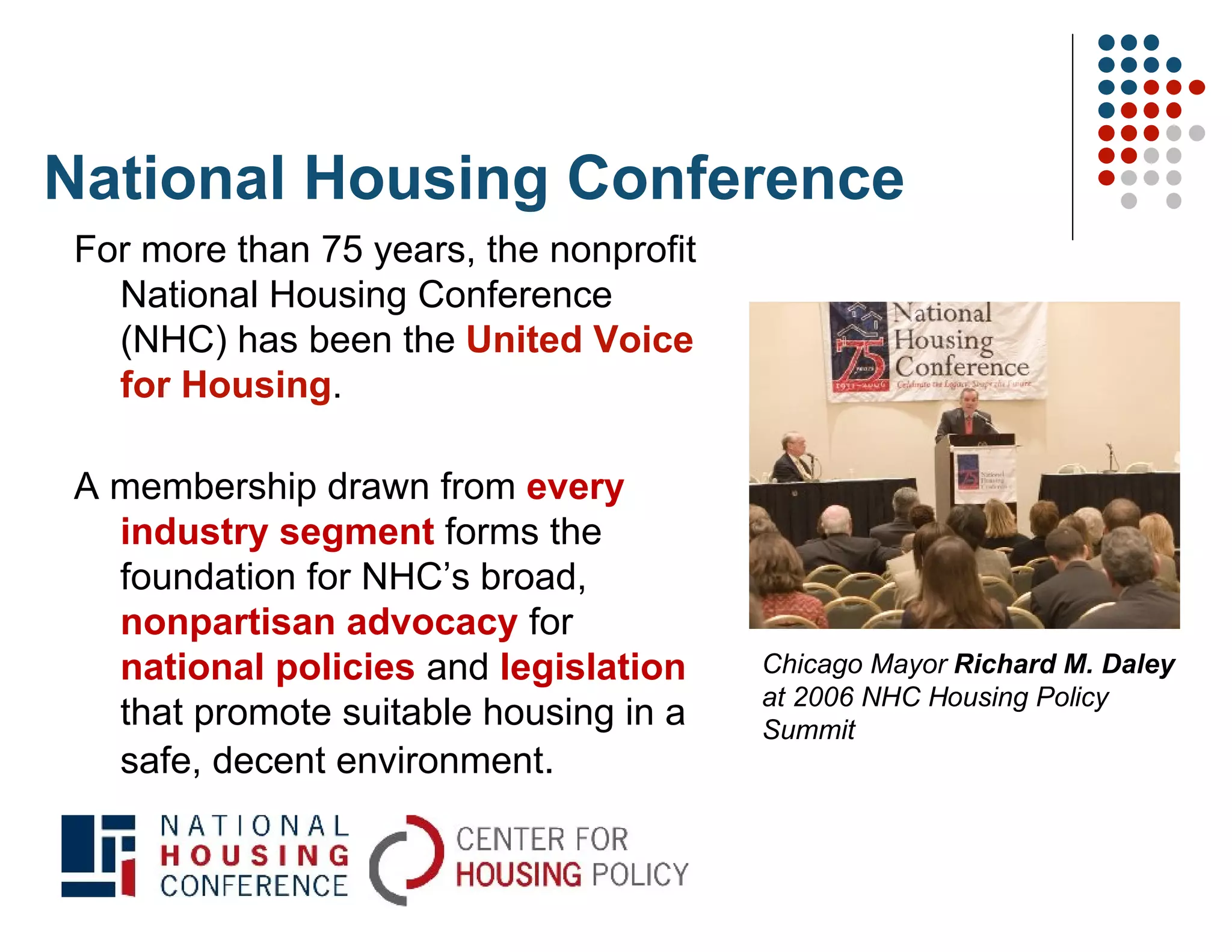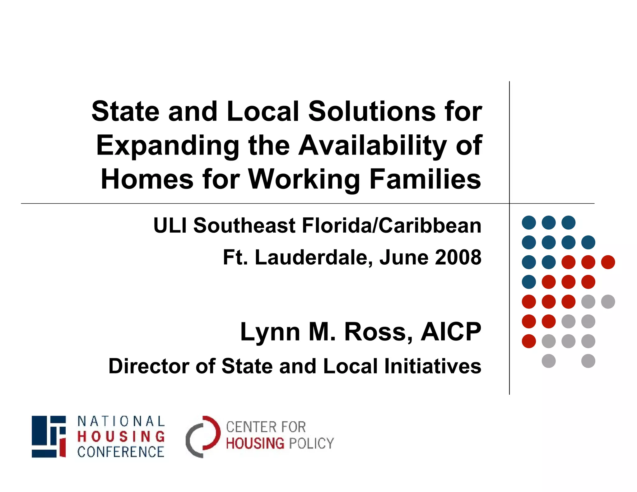 The document discusses strategies for expanding the availability of affordable homes for working families through state and local policies, highlighting the need for tailored approaches due to varying housing costs and challenges. It outlines six key roles for localities and states, such as expanding development opportunities and reducing bureaucratic obstacles, complemented by real-world examples of successful initiatives. The National Housing Conference emphasizes collaboration among stakeholders to address housing needs effectively and invites feedback for continuous improvement of housing policy resources.