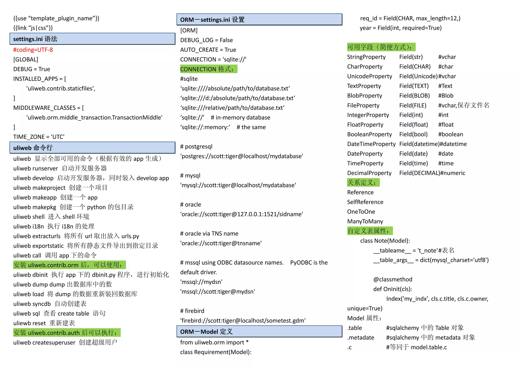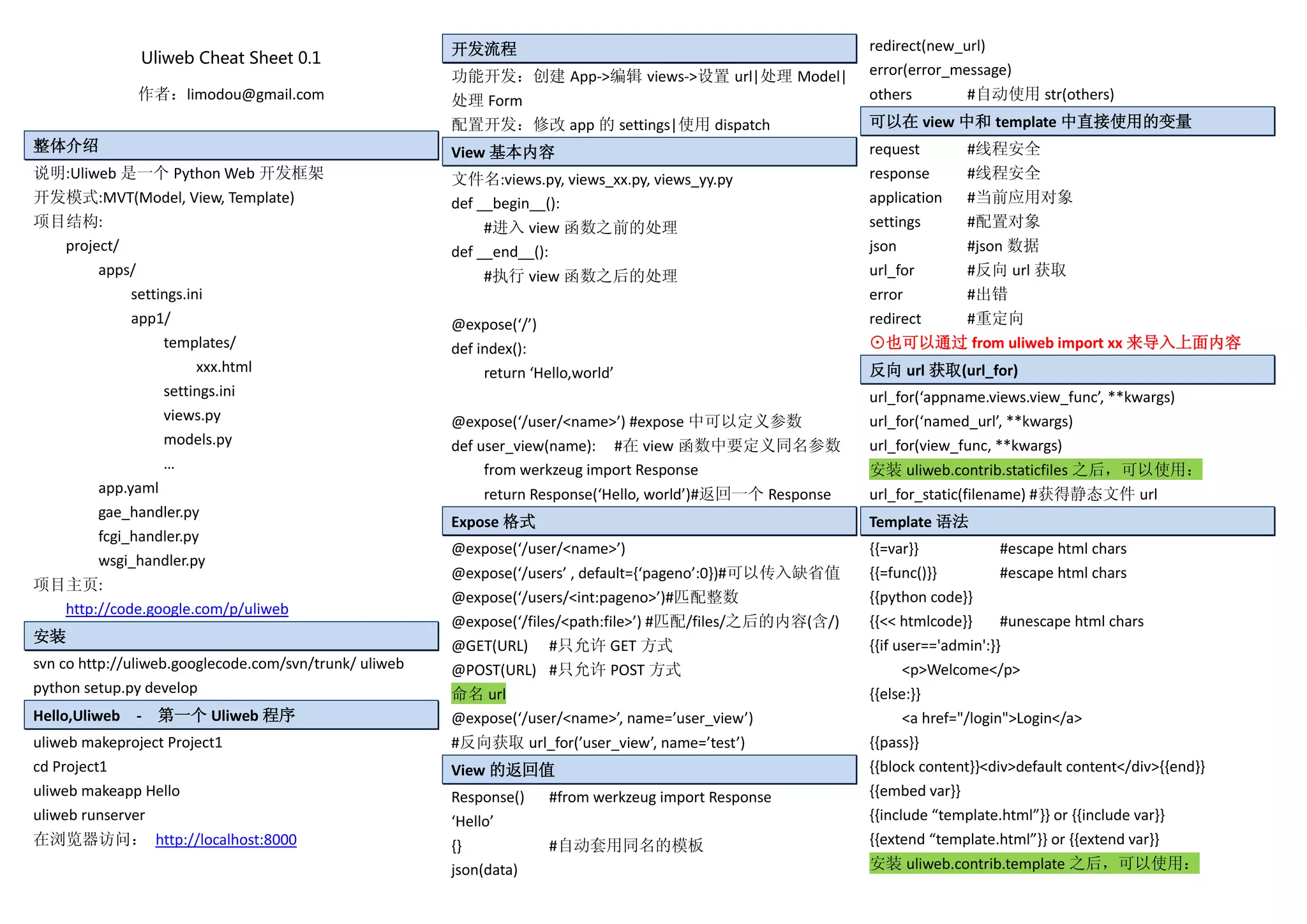 Uliweb是一个Python Web开发框架,采用MVT(模型-视图-模板)结构,支持创建和管理Web应用程序,通过命令行工具和配置文件进行项目管理和设置。文档详细介绍了基本的开发流程,包括功能开发、视图处理、URL框架及ORM操作等,同时包含了多种命令的使用方法和示例,以助于开发者高效构建应用。最后,Uliweb支持静态文件处理和国际化功能,适用于多种数据库连接配置。