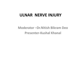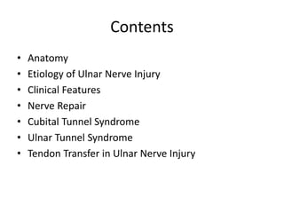 This document provides an overview of ulnar nerve injury, including: