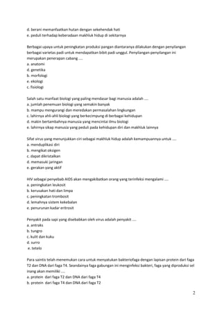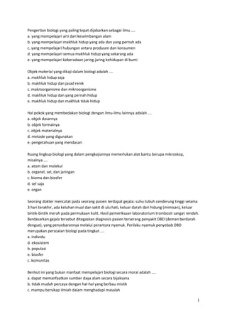 Dokumen ini membahas tentang pengertian dan ruang lingkup biologi, serta objek yang dikaji dalam ilmu biologi. Terdapat juga penjelasan tentang karakteristik virus dan bakteri, termasuk reproduksinya serta penyakit yang ditimbulkan oleh keduanya. Selain itu, dokumen ini mencakup manfaat mempelajari biologi bagi manusia dan juga berbagai cabang ilmu yang terkait.