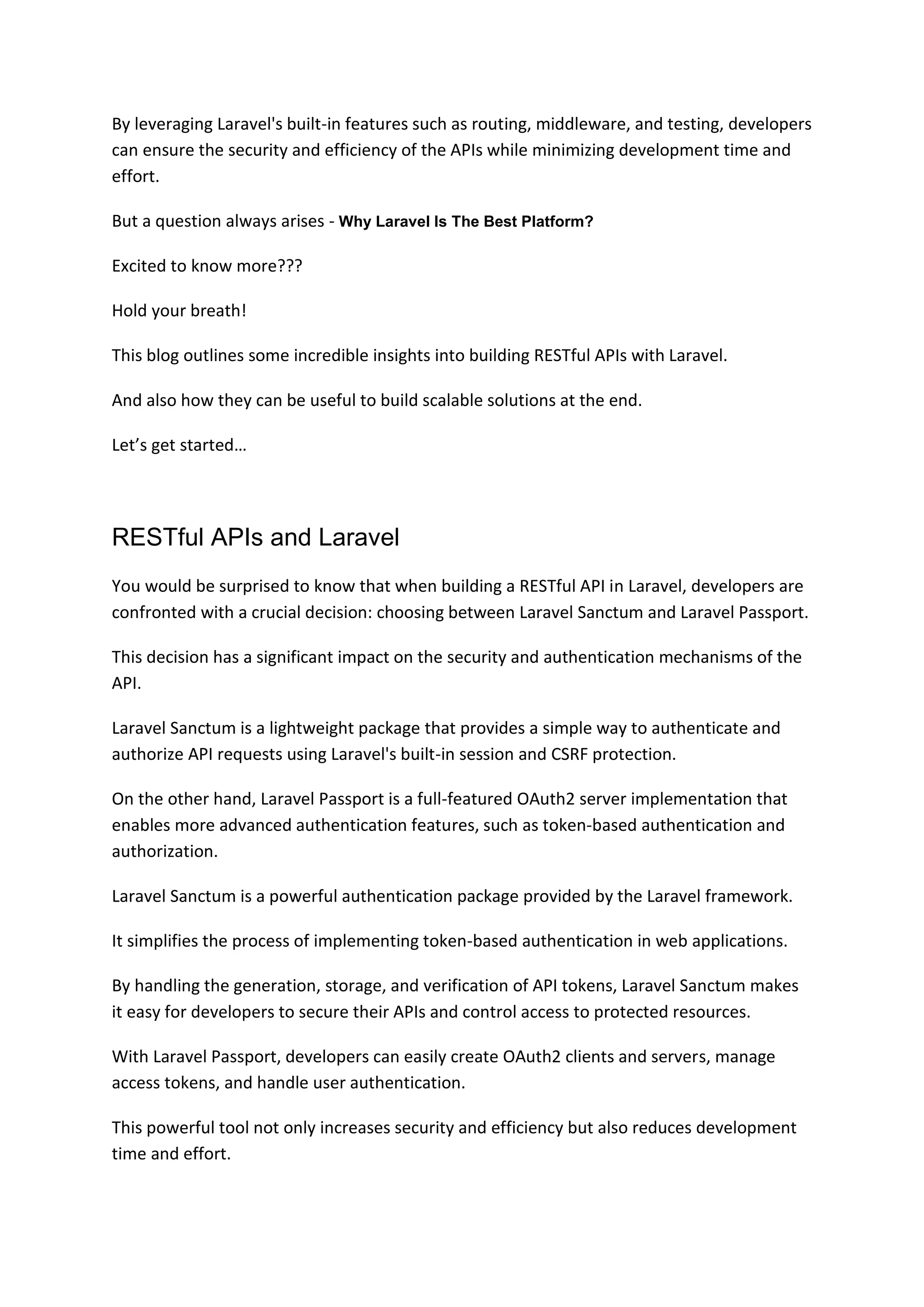Laravel is highlighted as an optimal platform for creating efficient APIs due to its elegant syntax, extensive documentation, and strong community support, making it accessible for both beginners and experienced developers. It offers robust built-in features like authentication through Laravel Sanctum and Passport, and essentials such as versioning, data validation, and pagination, which streamline the development process. By leveraging these tools, developers can create scalable, secure, and high-performing RESTful APIs that align with modern web demands.