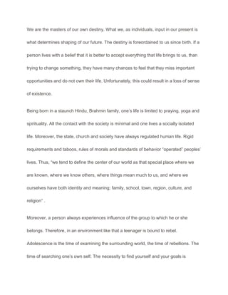 - The document discusses how individuals shape their own destiny through their actions and beliefs, rather than accepting what life brings without trying to change things. It argues people miss opportunities if they do not take control of their own lives.