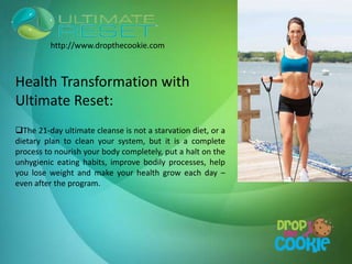 The Ultimate Reset is a 21-day cleanse program that aims to nourish the body, improve eating habits, boost bodily processes, aid in weight loss and improve health. It works to remove harmful items like toxins, bacteria and viruses that can disrupt organ function and immunity. The program provides supplements, support materials and workouts to strengthen the immune system, increase energy, support digestion and metabolism, boost mood and mental clarity. Customers saw positive results from the Ultimate Reset cleanse in attaining better health.