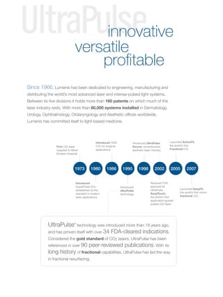 The document discusses fractional laser treatments from Lumenis including ActiveFX, DeepFX, and TotalFX. It summarizes the evolution of Lumenis' UltraPulse fractional CO2 laser technology over the past 18+ years, from early continuous wave lasers to current short pulse technology. The UltraPulse system provides versatile single-platform fractional capabilities with ActiveFX and DeepFX, allowing customizable coverage and depth for various indications.