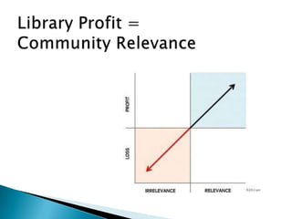 The document discusses how libraries are struggling with relevance in the digital age and how their design, services, and branding are changing as a result. It provides background on library construction trends between 1995-2008 and discusses how capital and operating costs are significant factors in library design and services. The document advocates that libraries establish relevance by creating a unified community vision, redefining roles and services both physically and digitally, effective branding, and smart technology integration. It also discusses challenges like balancing user needs with funding requirements and negotiating partnerships between different stakeholders. Overall, the document examines how libraries are adapting spaces, services, and branding to remain relevant institutions in a technology-driven world.