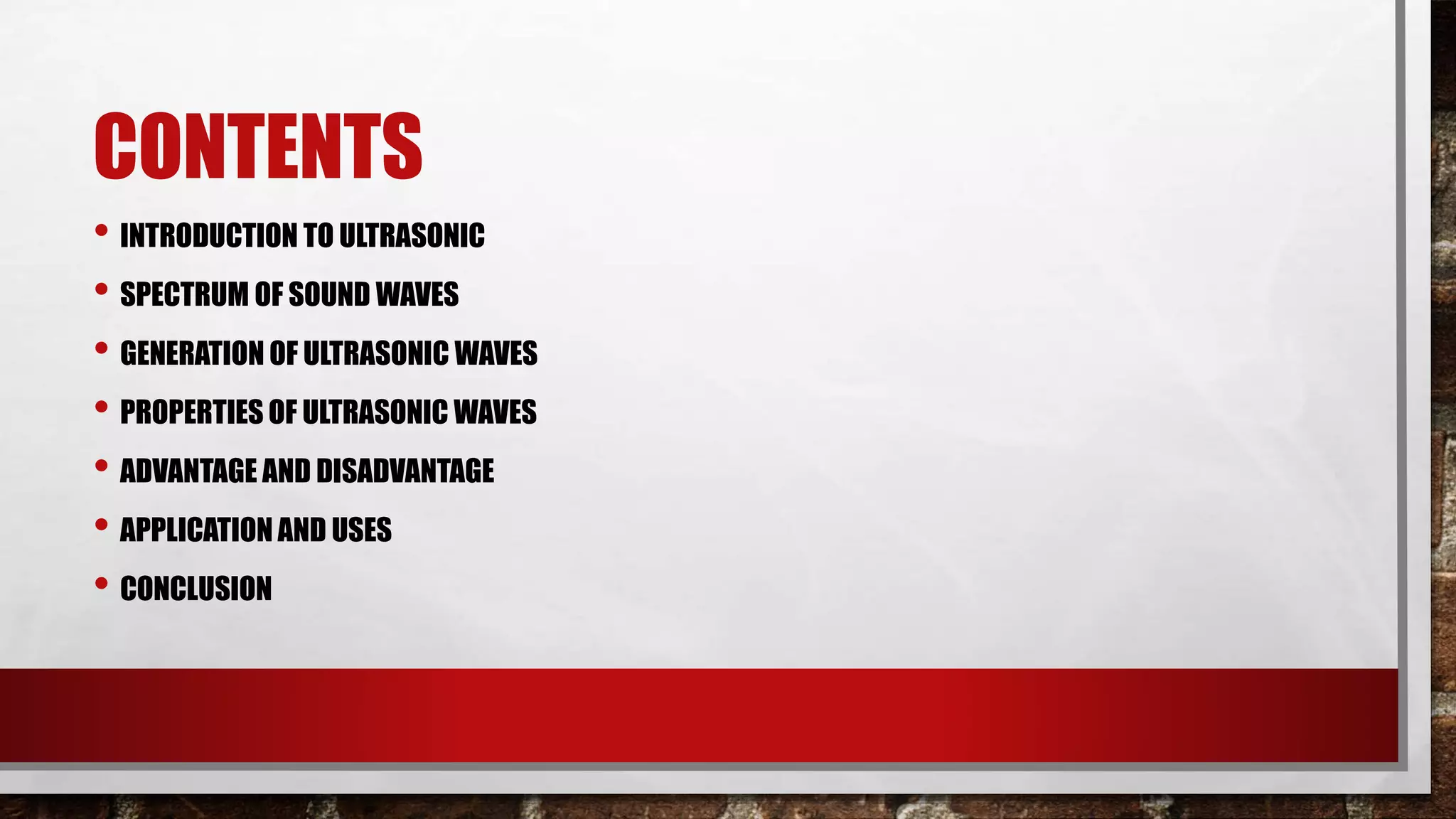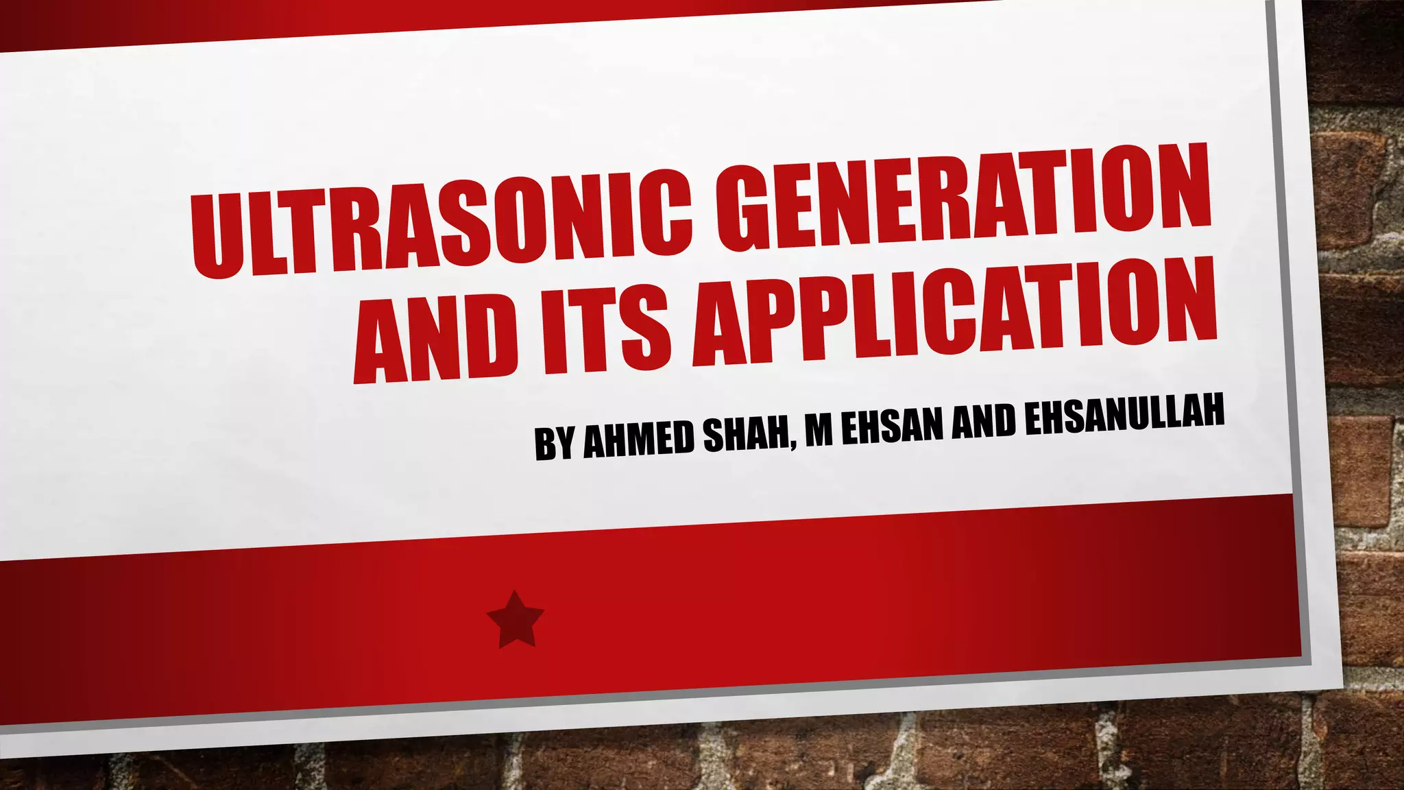 This document discusses ultrasonic waves, which are sound waves with frequencies above the normal hearing range of humans. It describes how ultrasonic waves are generated using piezoelectric and magnetostriction oscillators. The properties and applications of ultrasonic waves are then outlined, including using them to detect flaws in metals, measure distances, determine ocean depths, cut and weld metals, and for medical uses like removing kidney stones. The document concludes that ultrasonic technology is used widely across various fields like medicine, testing products, cleaning, and by some animals.