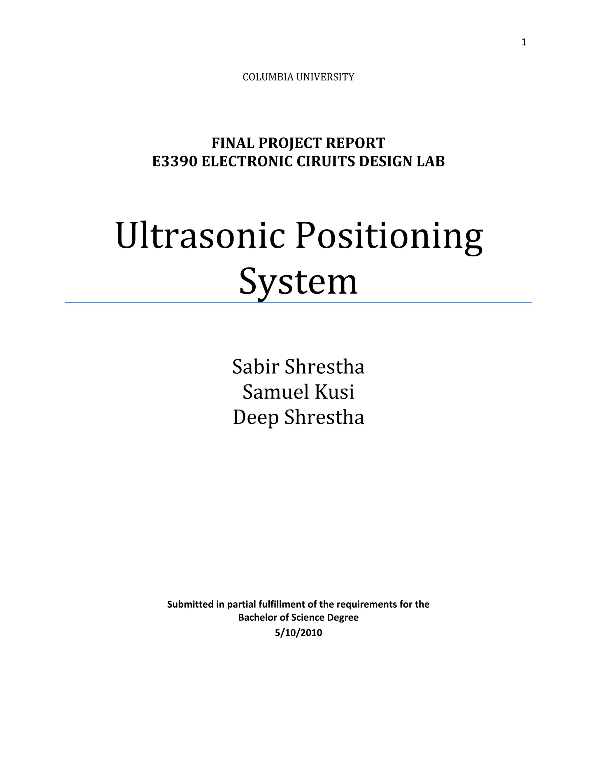 This project developed an ultrasonic positioning system that uses trilateration to determine the position of an ultrasonic transmitter based on the time delays of signals received by three receivers. The system includes a transmitter that pulses ultrasonic signals every 5 milliseconds, receivers that amplify and convert received signals, and an Arduino that calculates the position using time differences between received pulses and displays the x,y coordinates. Some challenges encountered were accurately recording pulse transmission and receipt times and dealing with noise interference.