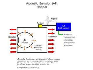 The document provides a detailed syllabus for Ultrasonic Testing (UT) and Acoustic Emission (AE) techniques, covering principles, instrumentation, data representation, and various ultrasonic applications. It discusses sound wave properties, testing techniques, and the use of different types of transducers and testing equipment relevant to flaw detection, thickness gauging, and quality assurance in mechanical engineering. Additionally, it highlights the importance of calibration standards and the diverse applications of ultrasonic inspection in various industries.