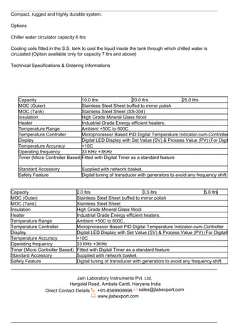The document provides a detailed description of the jlab JL-B-1955 ultrasonic water bath, noting its efficient cleaning action, low power consumption, and safety features. It includes specifications such as temperature control range from ambient +5°C to 60°C, capacity options, and digital indicators. Additionally, it outlines optional accessories like a chiller water circulator and the materials used in construction.