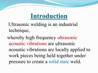 Ultrasonic welding uses high frequency sound waves to melt and bond materials like plastics and thin metals. It is a fast, non-contaminating technique that requires no consumables and minimizes heat affected zones and surface deformation. Ultrasonic waves are transmitted through parts held under pressure to generate localized heat through friction, welding the materials together in under 3 seconds with or without external heat. It can weld a variety of materials like plastics, metals, and glass and is used in industries like electronics, automotive, medical, and more.