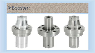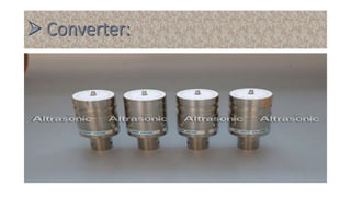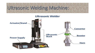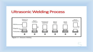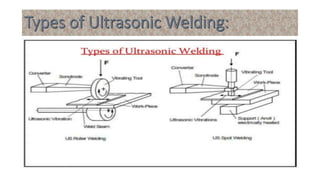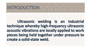 Ultrasonic welding uses high frequency ultrasonic vibrations to generate frictional heat and join materials under pressure. The vibrations are generated between 15-60 kHz by a transducer and transmitted to the parts through a sonotrode. Welding times are typically less than 3 seconds. Dissimilar materials and thin materials can be welded with minimal surface deformation and heat affected zones.