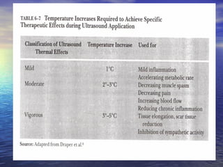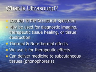 Ultrasound uses high frequency sound waves to produce either thermal or non-thermal effects in tissues. It works by using a transducer that converts electrical energy into longitudinal sound waves through the piezoelectric effect. These waves can be used for diagnostic imaging or to accelerate tissue healing by increasing blood flow and the activity of immune cells through both thermal and non-thermal mechanisms of action. The document provides details on ultrasound wave properties, transducer types, intensities, and clinical applications.