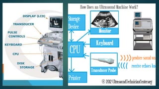 Ultrasound machines use high frequency sound waves to produce medical images of the body. They work by sending sound waves from a transducer probe into the body and receiving the echoes to produce images. There are two main types - 2D which shows a 2D image of 3D structures, and Doppler which measures blood flow. Ultrasound is widely used in obstetrics, cardiology, and urology due to its ability to image without radiation and its speed compared to other techniques. While ultrasound has advantages of being radiation-free and fast, it can cause local tissue heating and bubble formation from absorbed ultrasound energy.