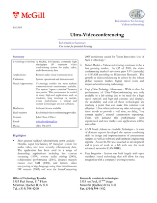 Ultra-Videoconferencing is an innovative videoconferencing system that provides high quality audio, video, and vibrosensory data transmission with very low latency. It has been used successfully in applications like live concerts and remote classes. The system is seeking a license with an established videoconferencing provider to commercialize the technology as videoconferencing continues to grow in popularity and capabilities advance.