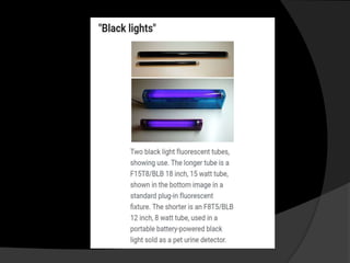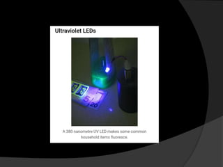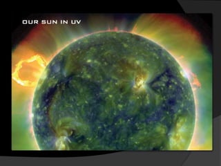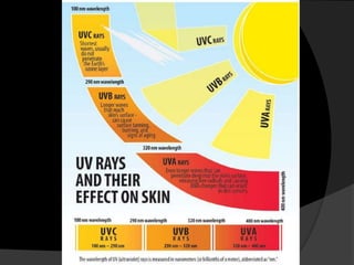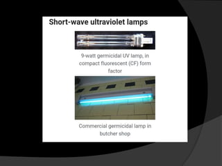 Ultraviolet (UV) radiation has wavelengths shorter than visible light. It is emitted by the sun and can be produced artificially. UV is divided into UVA, UVB, and UVC. While overexposure can harm health, moderate UV has benefits like vitamin D production. UV is used in applications like disinfection, lithography, and forensic analysis due to its ability to cause chemical reactions and fluorescence.