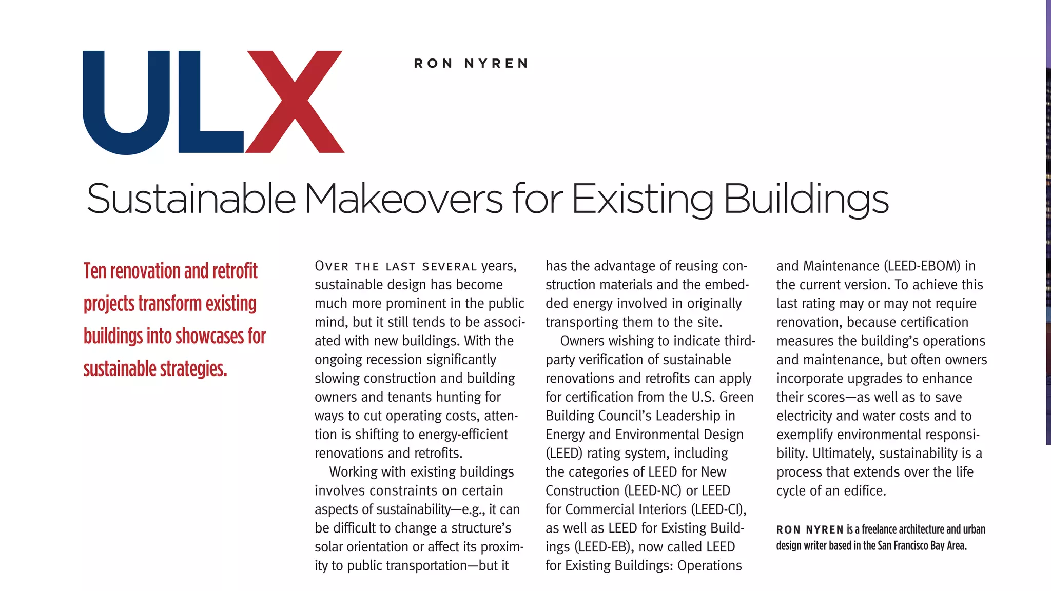 1. The document discusses 10 renovation and retrofit projects that transformed existing buildings into showcases for sustainable strategies. These projects incorporated energy and water efficiency upgrades, renewable energy systems, sustainable materials, and in some cases earned LEED certification. They demonstrate how existing buildings can be renovated to significantly reduce their environmental impact.