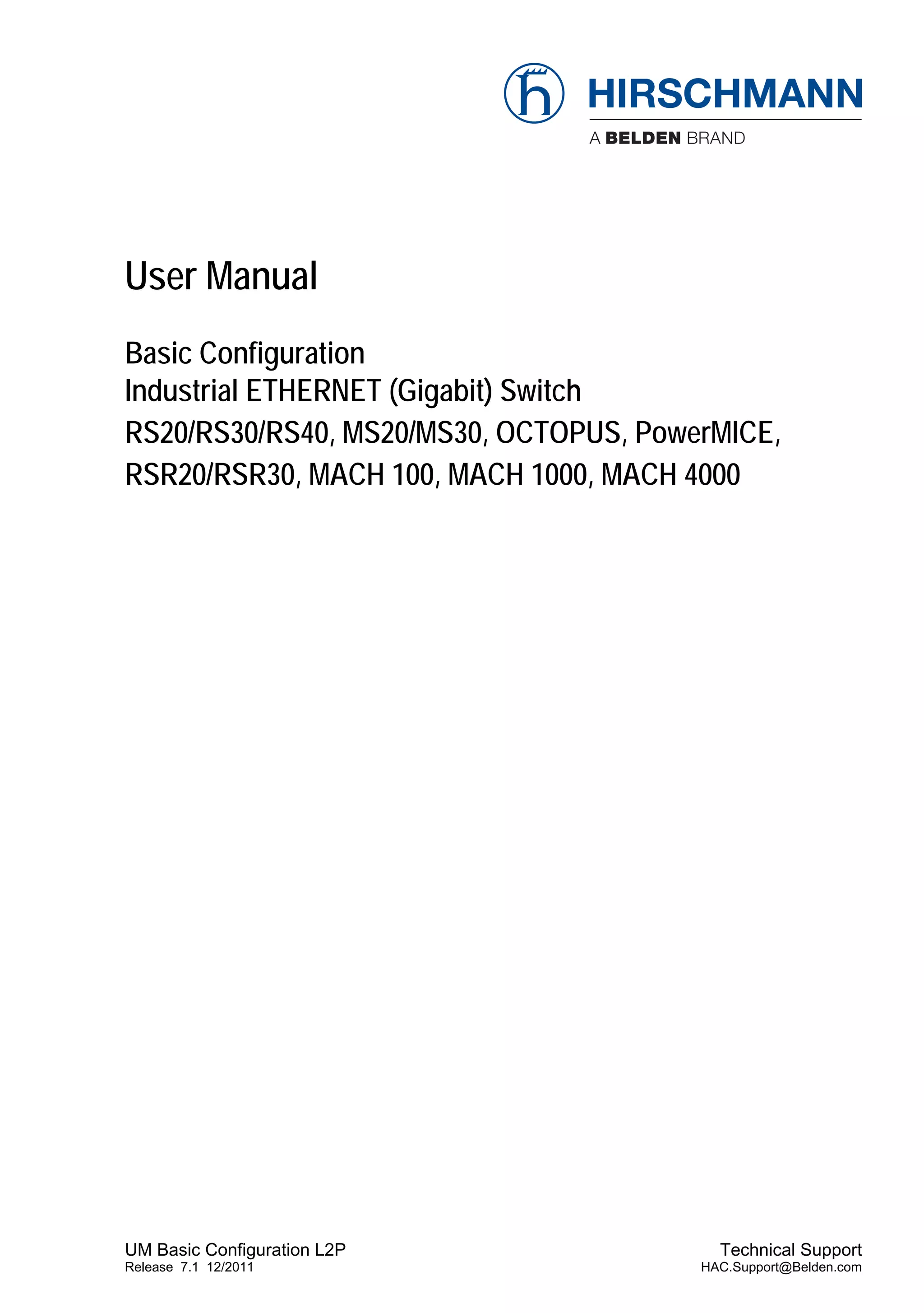 This document provides a user manual for basic configuration of Hirschmann industrial Ethernet switches. It guides the user through initial startup, IP configuration, software updates, port configuration, security settings, network optimization, system time synchronization, operation diagnosis, and saving the configuration. The manual also describes additional support documentation and software that is available to aid in configuration.