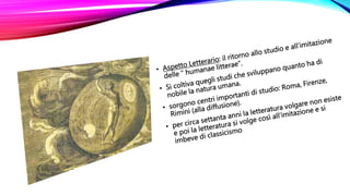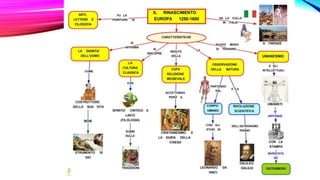 L'umanesimo e il rinascimento segnano l'inizio dell'età moderna, con l'umanesimo che pone l'essere umano al centro della natura e riduce l'influenza della religione. La corte dei Gonzaga di Mantova e l'architettura di Filippo Brunelleschi, che introduce tecniche innovative nel design del duomo, sono esempi significativi di questo periodo. Il documento è scritto da Viviana I. Portales nel 2016 per la scuola di lingua italiana Dante Alighieri.