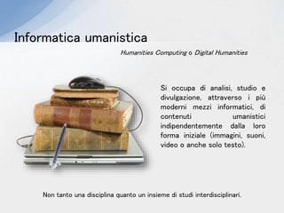 Il documento discute l'importanza delle discipline umanistiche digitali e delle tecnologie dell'informazione e della comunicazione (TIC) nell'educazione, evidenziando l'analisi e la divulgazione di contenuti umanistici attraverso mezzi informatici. Presenta vari strumenti e risorse didattiche, come biblioteche digitali, social reading e applicazioni di storytelling visivo. Inoltre, sottolinea l'importanza della produzione e della fruizione collaborativa, offrendo esempi di piattaforme e risorse per l'insegnamento delle materie umanistiche.