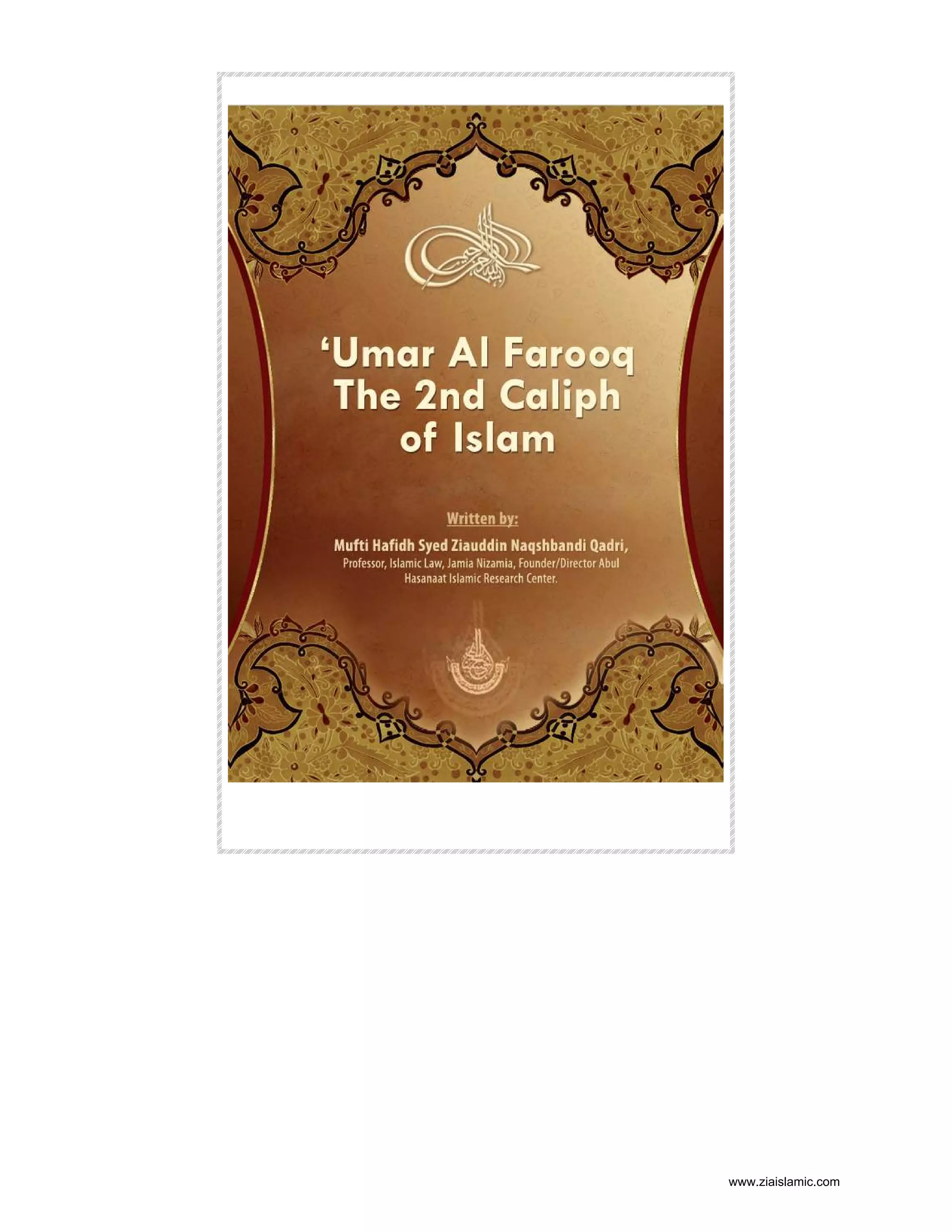 This document provides biographical details about Umar ibn al-Khattab, the second caliph of Islam. It discusses his lineage, birth, embracing of Islam, excellence as a leader, justice in governance, and glad tidings of martyrdom. The document emphasizes Umar's high status as a companion of the Prophet Muhammad and his role in spreading Islam through his justice and fairness as caliph.
