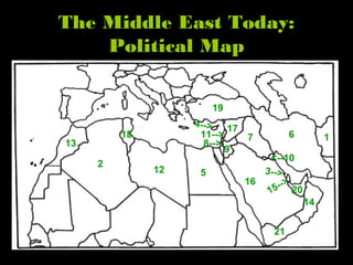 This document provides an overview of the physical geography of the Middle East region. It includes maps and descriptions of the major physical features of the region, such as bodies of water like the Tigris, Euphrates, Nile, and Jordan Rivers as well as deserts like the Sahara and Rub al-Khali. It also discusses climate regions, population density patterns, and key natural resources like oil reserves found in the Persian Gulf.
