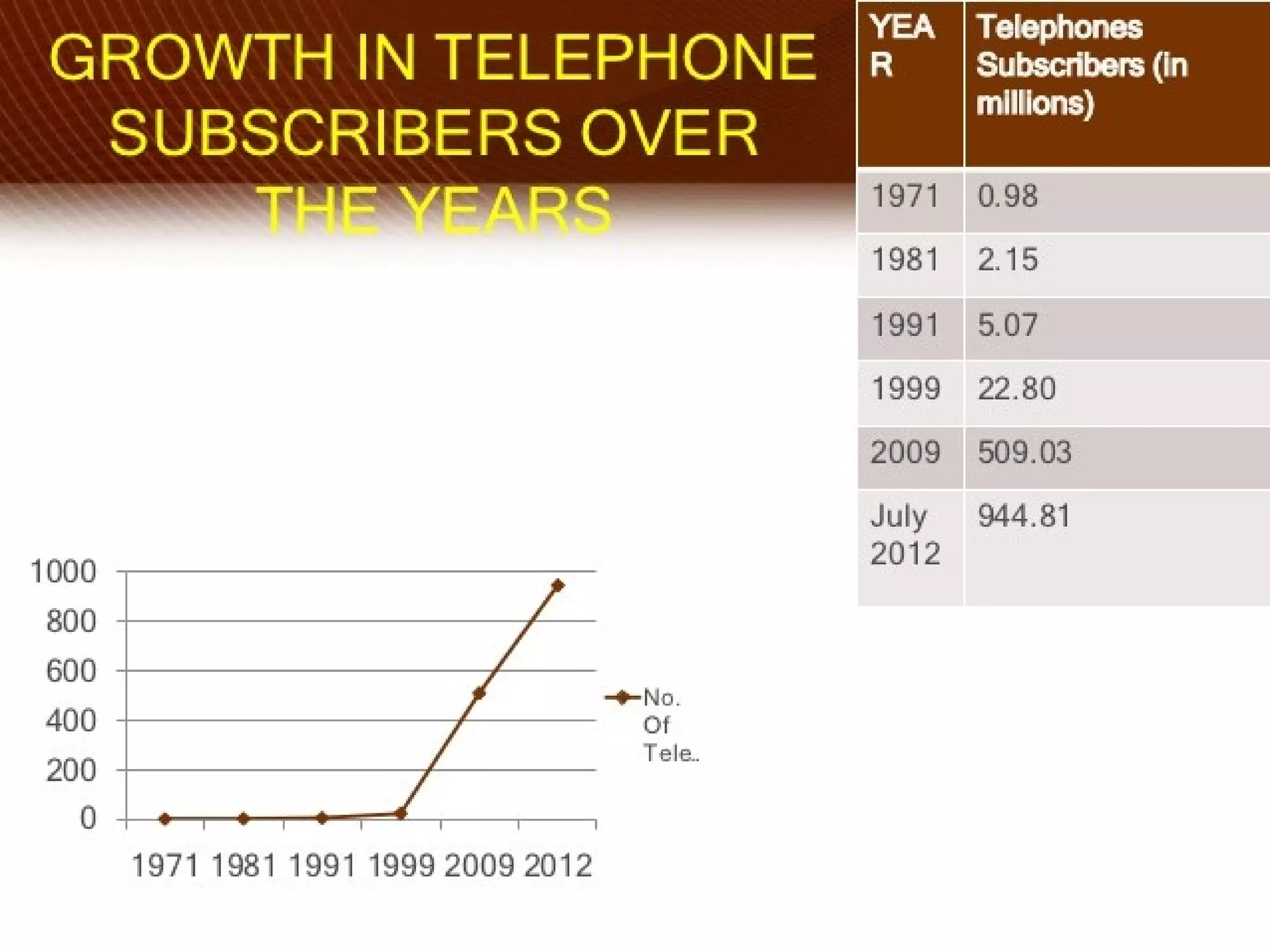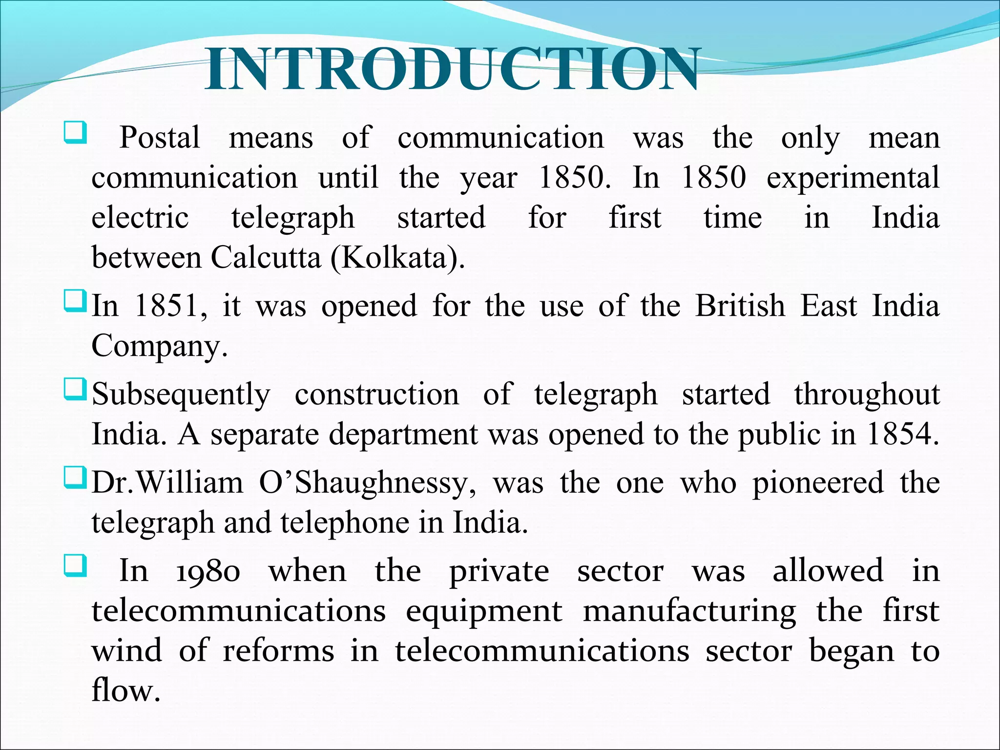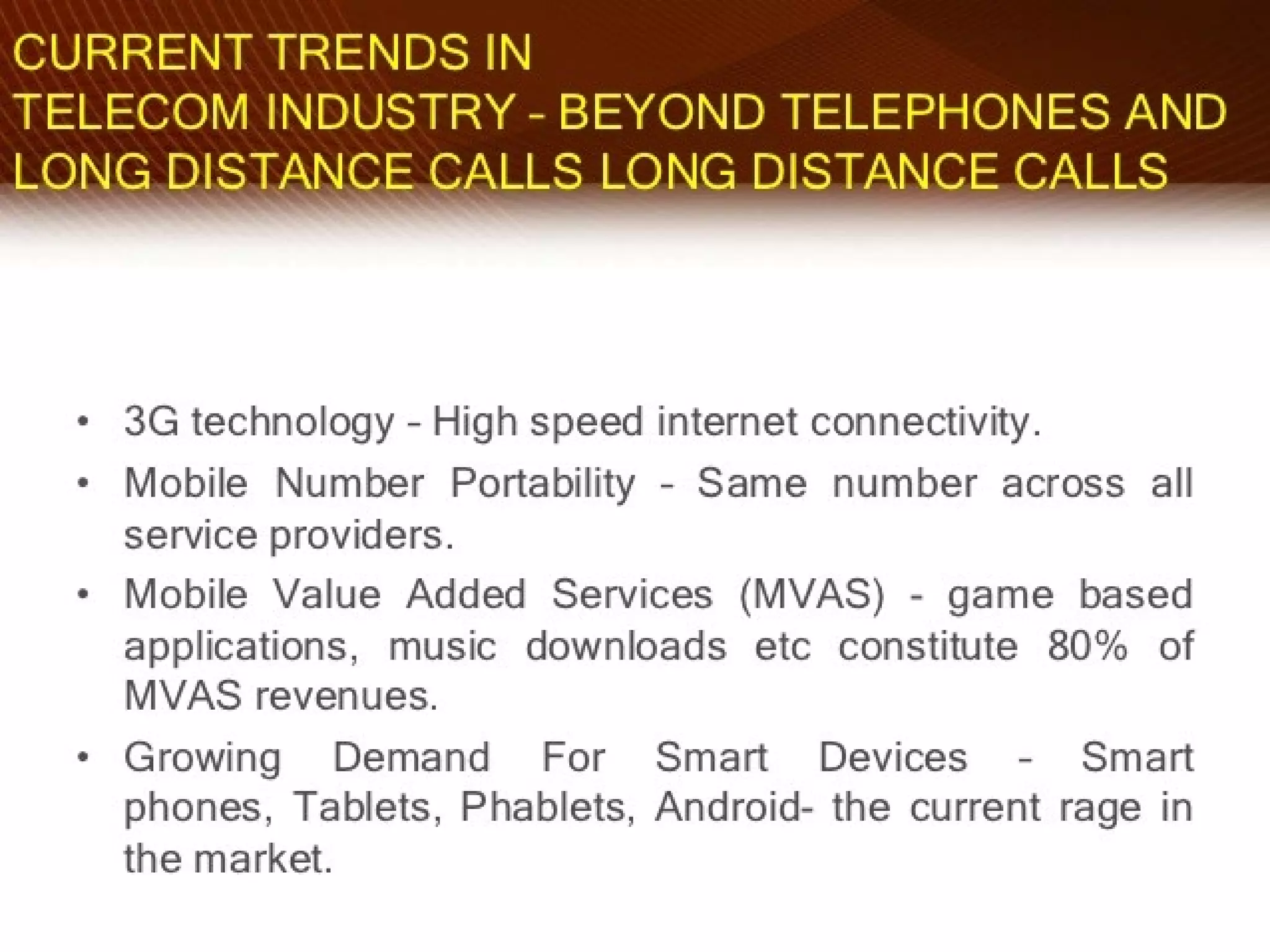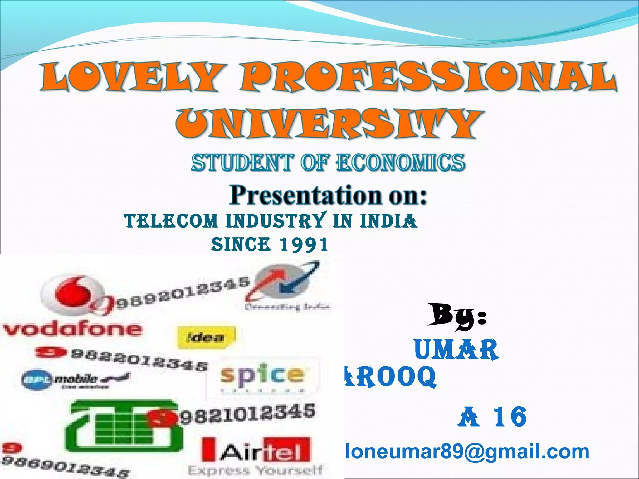 The telecom industry in India has grown significantly since market reforms began in 1991. It has expanded from primarily landline services to having over 900 million mobile subscribers as of 2012, accounting for nearly 12% of global users. Key drivers of growth have been low cost mobile phones, rural connectivity initiatives, and value-added services. However, challenges remain such as limited spectrum availability, lack of rural infrastructure, and high taxes. The industry has proven resilient during the global economic slowdown. Moving forward, recommendations include ensuring fair spectrum and access policies, rural infrastructure development, and tax reforms to further strengthen the telecom sector.