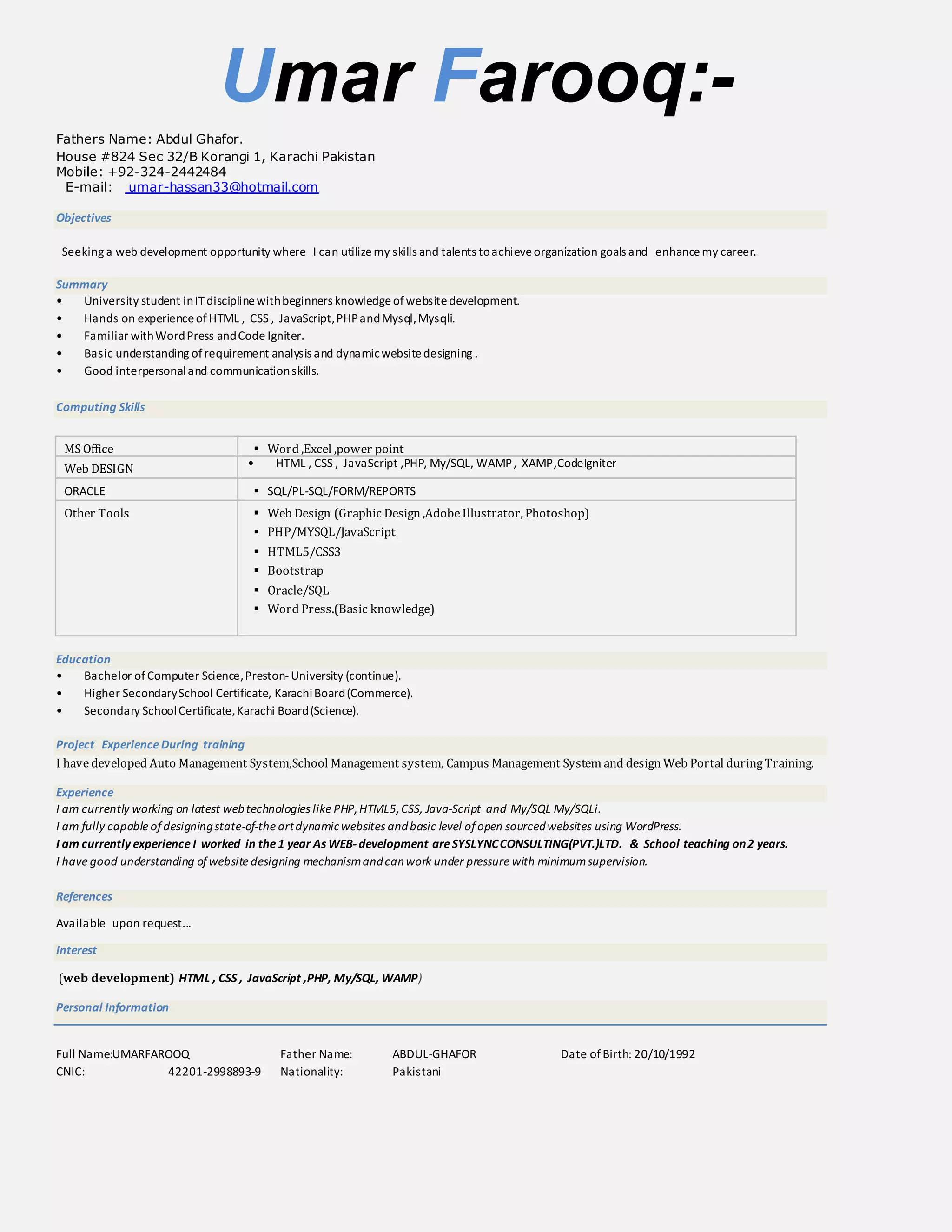 Umar Farooq is a web developer from Karachi, Pakistan seeking new opportunities. He has a bachelor's degree in computer science and experience developing auto, school, and campus management systems using technologies like PHP, HTML5, CSS, JavaScript, MySQL, and WordPress. His contact information and skills are summarized, including programming languages, tools, and 1 year of work experience in web development.