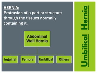 1. An umbilical hernia is a protrusion of abdominal contents through the abdominal wall near the umbilicus.