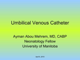 This document discusses umbilical venous catheters used in neonates, including three case studies. It outlines complications that can arise from malpositioning of the catheter tip, such as perforation of blood vessels, ascites, cardiac issues, and liver damage. Predicting the proper insertion length is difficult and radiography is not always reliable in confirming tip location. The recommendation is that further research is needed to determine the best length of insertion and that repeated imaging may help ensure the tip remains in the correct position.
