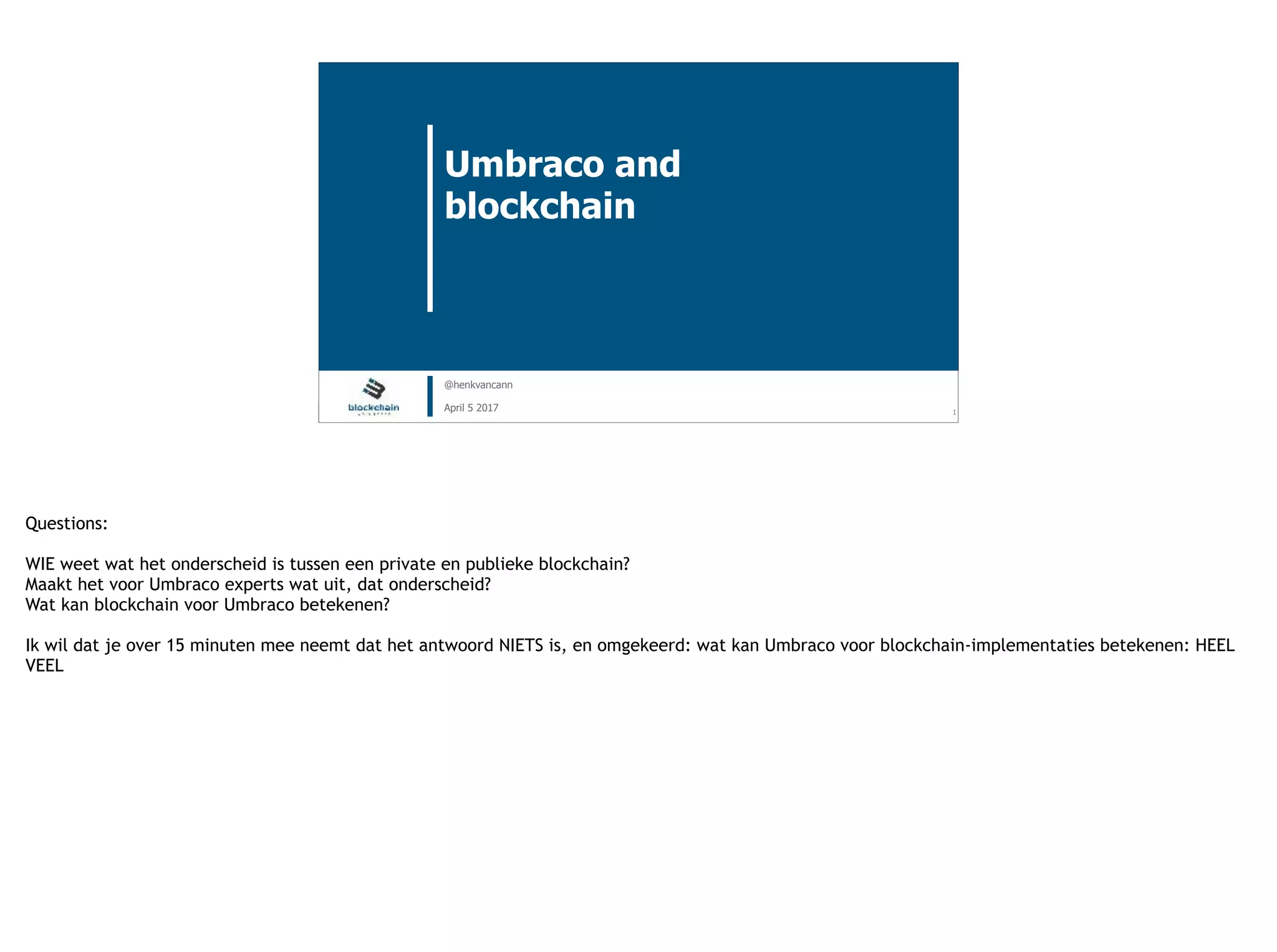 Ik wil dat je over 15 minuten mee neemt dat het antwoord NIETS is, en omgekeerd: wat kan Umbraco voor blockchain-implementaties betekenen: HEEL