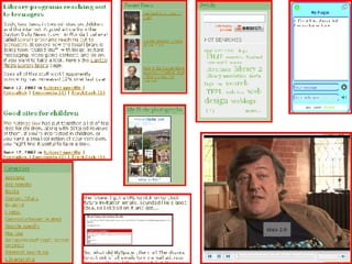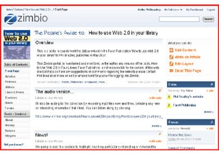 The document discusses practical uses of Web 2.0 technologies in a library environment. It outlines how libraries can use blogs, RSS feeds, podcasts, social networking, wikis, instant messaging, and more to engage users, share information, and collaborate. While some may see challenges, the document argues that Web 2.0 is changing how people use and find information and how libraries do their jobs.