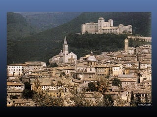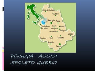 Il documento descrive vari luoghi di interesse storico e culturale in Umbria, tra cui la Cattedrale di San Lorenzo a Perugia, la Galleria Nazionale dell'Umbria, e la Rocca Paolina. Viene evidenziata l'importanza artistica e architettonica di questi edifici, con dettagli sulle opere e le caratteristiche architettoniche. Include anche informazioni su eventi folkloristici legati a luoghi come la Basilica di Sant'Ubaldo e il Palazzo dei Consoli di Gubbio.