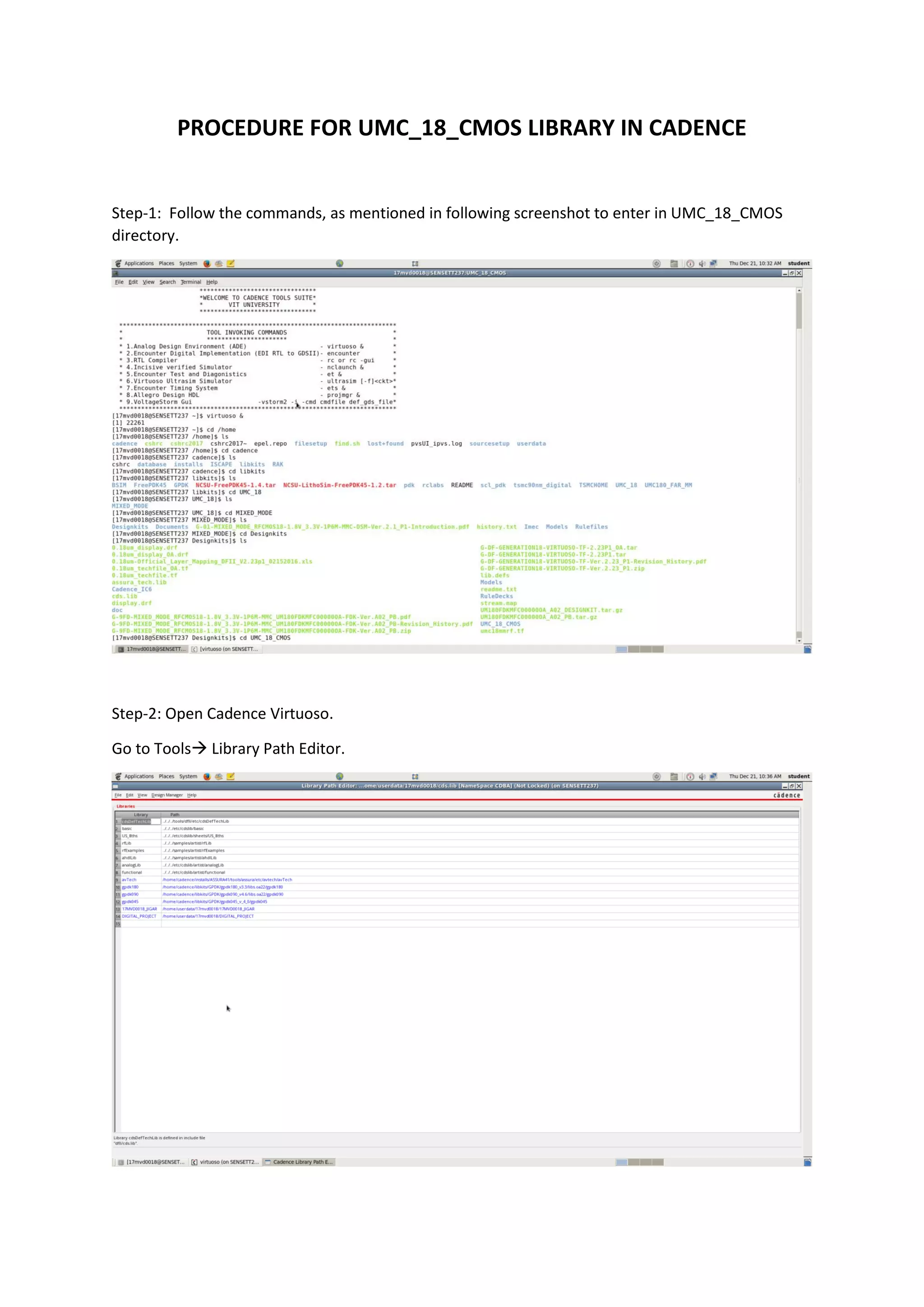 The document provides steps to add and use the UMC_18_CMOS library in Cadence: 1. Open Cadence Virtuoso and add the UMC_18_CMOS library by navigating to the highlighted path. 2. Create a new cell view and go to the model library setup to select the UMC spectre model library file. 3. Pick the NMOS and PMOS devices from the UMC_18_CMOS library and perform further circuit design and analysis steps as done previously with another library.