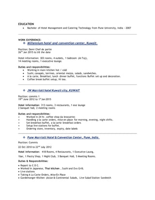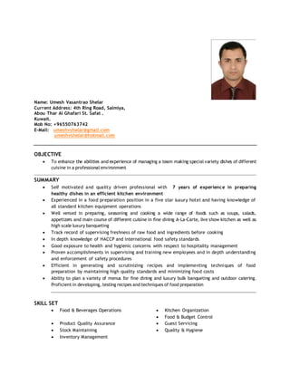 - Umesh Vasantrao Shelar is a self-motivated chef with over 7 years of experience in fine dining kitchens at luxury hotels in India and Kuwait, seeking to enhance abilities in managing a team that prepares healthy dishes from various cuisines.