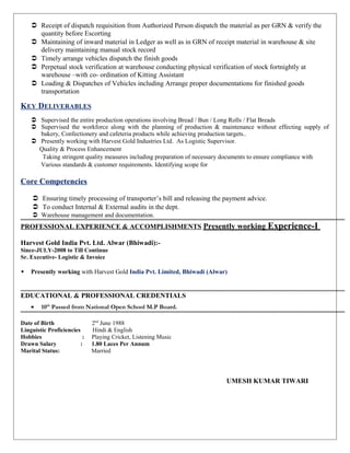Umesh Kumar Tiwari has over 8 years of experience working in logistics and dispatch roles. He is currently a Senior Executive of Logistics at Harvest Gold India Pvt. Ltd., where he is responsible for arranging loading and unloading of vehicles, preparing invoices, and ensuring timely dispatch of finished goods. He has expertise in ERP systems, warehouse management, documentation, and quality processes. Umesh holds a 10th standard certification from the National Open School M.P Board and is proficient in Hindi and English.