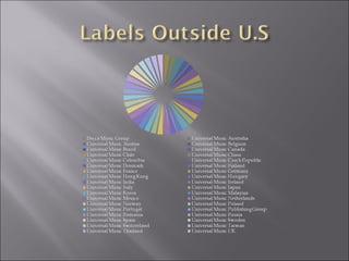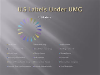 Universal Music Group is one of the largest music conglomerates in the world. It owns and distributes the work of many popular artists like Lady Gaga, Timbaland, and Bon Jovi. The company's CEO, Doug Morris, is planning to step down in 2010 and will likely be replaced by Lucian Grainge. UMG distributes music in both physical and digital formats through various online retailers and streaming services. This allows the company to market its artists and music to a massive online audience.