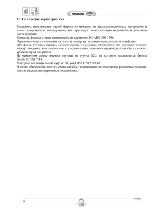 Документ содержит технические характеристики и эксплуатационные показатели редукторов, производимых фирмой, включая информацию о материалах, моделях, осевых и радиальных нагрузках. Обсуждаются особенности конструкции, такие как применение качественных материалов и модульность, что обеспечивает надежность и легкость обслуживания. Также предоставлены таблицы с данными о допустимых нагрузках и размерах, а также рекомендации по смазке и монтажу.