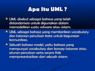 UML adalah bahasa standar untuk memodelkan sistem perangkat lunak yang menyediakan notasi visual untuk menggambarkan konsep berorientasi objek, seperti use case diagram, class diagram, sequence diagram, dan activity diagram. UML memudahkan komunikasi dan pemodelan sistem perangkat lunak.