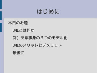 はじめに 本日のお題 UMLとは何か 例)ある事象の3つのモデル化 UMLのメリットとデメリット 最後に