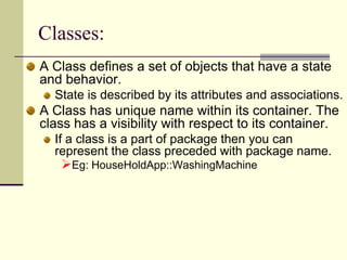 The document discusses UML (Unified Modeling Language) and object-oriented software development. It describes the software development life cycle and various modeling techniques used in UML, including use case diagrams, class diagrams, sequence diagrams, and collaboration diagrams. It explains key UML concepts such as classes, objects, attributes, operations, actors, and relationships. The benefits of visual modeling and UML are also summarized.